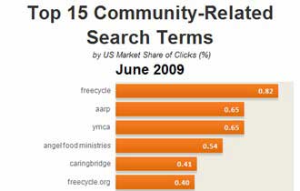 Top 15 Community-Related Search Terms, June 2009Non-ProfitThe top community-related search terms in June were led by "freecycle," "aarp," and "ymca." The top 15 terms deal mostly with nonprofit and charitable organizations.
